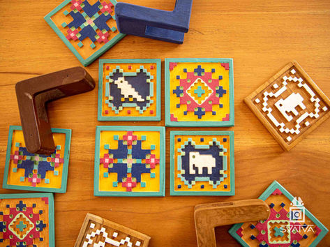 These coasters come in a pair available in teak wood or MDF along with a lovely display stand. The coaster tops feature elegantly carved Chandā Bhāt and Rosette Patola motifs, each skilfully hand-painted in vibrant colours. The pop of colours adds a visually pleasing touch to your dining or coffee table. Impress your guests by serving refreshments on these stylish coasters and showcase your refined taste.