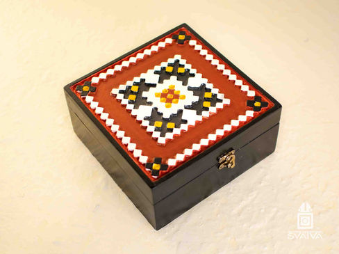 This storage box boasts a unique and stunning 'Chokaḍī Bhāt' Patola design on its lid. It's an excellent storage option for keeping your precious trinkets, jewellery, and knickknacks safe while also serving as a luxurious gift box for special occasions like weddings. It is a lovely accent piece for your dining table, coffee table or dresser. The ‘Chokaḍī Bhāt’ Storage Box comes in two colours to suit your taste – a warm teak finish with a colourful top and a dark finish with a neutral top.