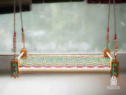 Our Hand-woven Cord Swings offer the perfect combination of a traditional charpai and a swing. They are ideal for sitting, lounging, sleeping and providing some much-needed "me time". Through our Charpai Swings, we aim to modernize this timeless piece of furniture by incorporating beautifully hand-carved and meticulously hand-painted ‘Patola’ motifs on the frame, as well as a double-weaving seat to prevent sagging and provide firm yet comfortable seating.